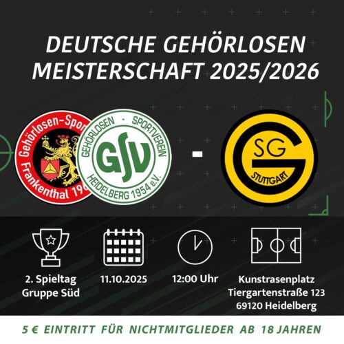 Sensation zum Saisonstart!! Die Spielgemeinschaft GSC Frankenthal/GSV Heidelberg schlägt Titelverteidiger GSG Stuttgart mit 1:0 (0:0)! Tore:1:0 Dennis Böttcher 80.min Am 11. Oktober 2025 startete die neu formierte Spielgemeinschaft GSC Frankenthal / GSV Heidelberg in die neue Saison der Deutschen Gehörlosen-Meisterschaft 2025/26. Gleich im ersten Spiel traf man auf den amtierenden Meister GSG Stuttgart. Von Beginn …