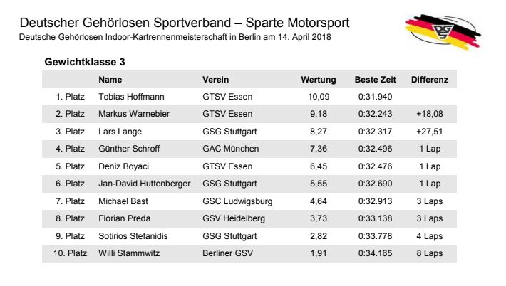 Motorsport – Ergebnis Deutsche Gehörlosen Meisterschaften Indoor Einzel 14.04.2018 in Berlin
