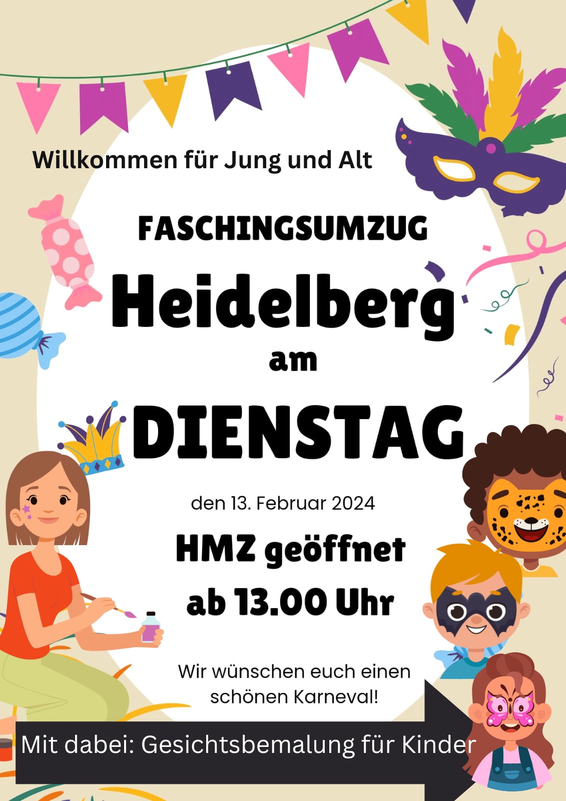 Am Faschingsdienstag ist das Heinz-Micol-Zentrum (Märzgasse 3, 69117 Heidelberg) ab 13:00 Uhr geöffnet. Alle sind herzlich willkommen. Ab 14:11 Uhr beginnt der Heidelberger Fastnachtszug.