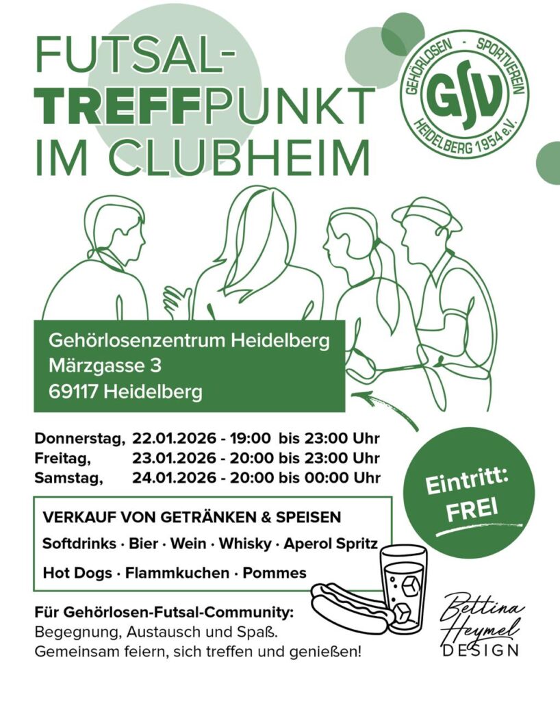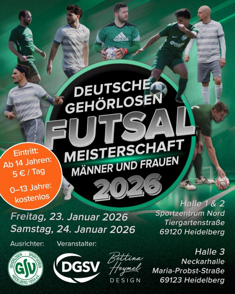 Die besten Gehörlosen-Futsal-Teams aus ganz Deutschland treffen sich in Heidelberg, um in spannenden und hochklassigen Spielen um den Deutschen Gehörlosen Meistertitel 2026 zu kämpfen! ⚽🔥